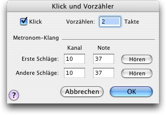 - OK • Abbrechen. Klicken Sie ‘Abbrechen’, um zur Partitur zurückzukehren ohne in der Dialogbox Änderungen vorzunehmen. Klicken Sie ‘OK’, um Ihre Einstellungen für Metronom-Klick und Vorzählen zu bestätigen und zur Partitur zurückzukehren.