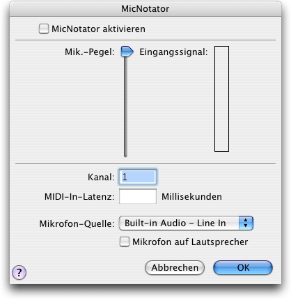 - OK • Abbrechen. Klicken Sie ‘OK’, um die Einstellungen in der Dialogbox ‘MicNotator’ zu bestätigen oder ‘Abbrechen’, um sie zu verwerfen und zur Partitur zurückzukehren.