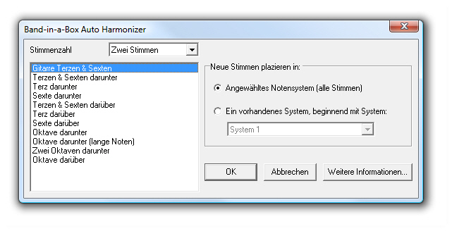 Eins darüber, Zwei darüber, Zwei darunter usw. – Die Zahl (Eins, Zwei) gibt an, wie viele Harmonienoten (keine Oktaven) über oder unter der Melodie platziert werden.
