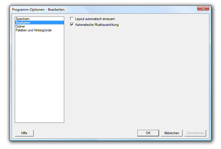 In der Dialogbox ‘Programm-Optionen’ können Sie zahlreiche und programmübergreifende Einstellungen wie die Zeitintervalle für das automatische Speichern, die Ordner für Musik, Vorlagen und das Benutzerhandbuch angeben. Die Dialogbox selbst ist in drei Kategorien aufgeteilt. Wählen Sie aus der linksstehenden Liste, um zu der gewünschten Kategorie zu gelangen.