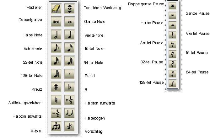 Die einzelnen Werkzeuge innerhalb der Paletten klicken Sie an, um einen bestimmten rhythmischen Wert oder andere Attribute auszuwählen. In erster Linie dienen die Werkzeuge natürlich zur unmittelbaren Noteneingabe. Die einzelnen Werkzeuge innerhalb einer Palette sind nochmal in verschiedene Gruppen untergliedert und angeordnet. So finden Sie eine Gruppe zur Auswahl des rhythmischen Werts, so etwa mit Symbolen für Viertelnote, Achtelnote usw. Weiterhin sehen Sie Werkzeuge für Vorzeichen wie Kreuz, B oder Auflösungszeichen, ein Haltebogen-Werkzeug, ein X-tolen-Werkzeug und u. a. schließlich ein Werkzeug zum Einfügen von Vorschlagsnoten.