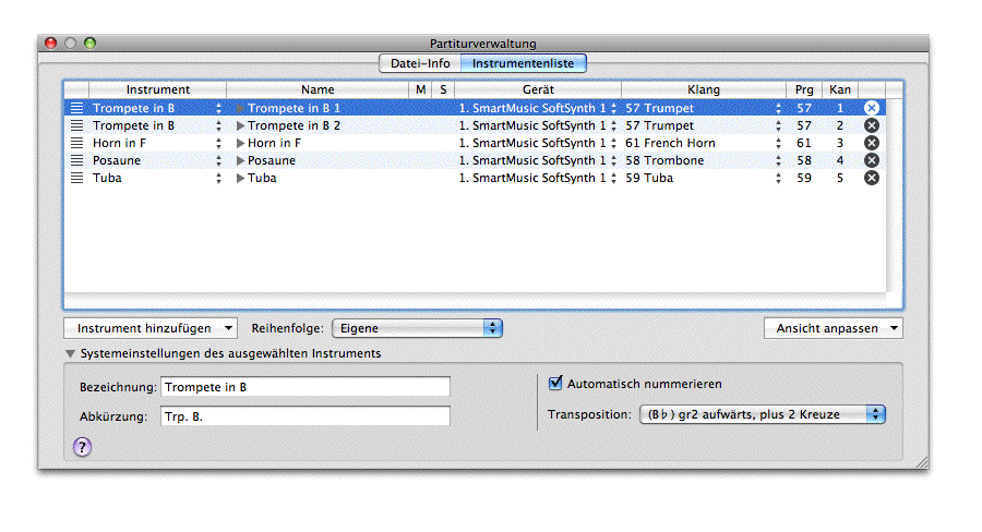 Das neue nicht definierte Instrument kann, wie jedes andere Instrument auch, bearbeitet, geändert oder gelöscht werden. Sie behandeln das nicht definierte Instrument genau so wie ein neu hinzugefügtes Instrument. Wenn es sich bei Ihrem Instrument um ein Instrument mit drei Notensystemen handelt, wie bei einer Orgel, ändert SongWriter das obere Notensystem und erzeugt zwei „Leere Notensysteme“.
