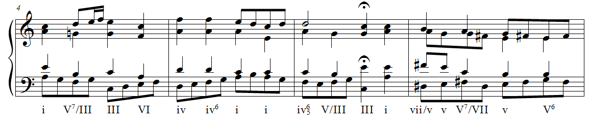 5. Tippen Sie die harmonische Analyse ein (ohne noch einmal in die Noten zu klicken). Die grundlegenden Angaben sind ganz einfach. Verwenden Sie v, i, V, I für die römischen Ziffern. Tippen Sie UMSCHALT+6 für eine erste Umkehrung. („6“ ist eines der vielen Symbole ohne Breitenangabe, das dazu gedacht ist, rechts oberhalb einer römischen Ziffer zu erscheinen.) Um eine Ziffer unter der 6 zu platzieren, drücken Sie einfach eine Zifferntaste (z. B. würden Sie für die Angabe i^4 folgendes tippen: „i, UMSCHALT+6, 4“). Weitere Einzelheiten finden Sie weiter unten.