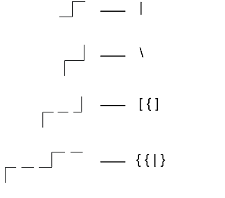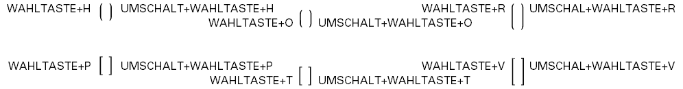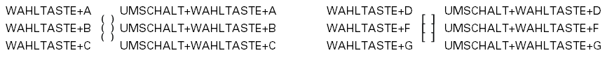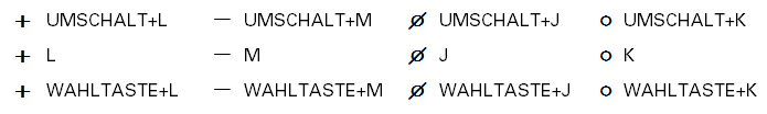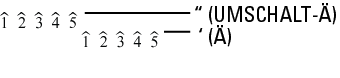 Diese Symbole haben keine Breitenangabe und sind dafür gedacht, rechts von einer Ziffer zu stehen. Entnehmen Sie die zugehörigen Tastendrücke für Symbol und Zeile der folgenden Tabelle.