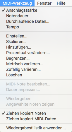 Der Zweck des MIDI-Werkzeugs ist es, die aufgenommenen MIDI-Daten zu bearbeiten. Sie können eine Passage lauter oder leiser machen, in einem Abschnitt ein „Swing-Feeling“ erstellen, den Pedalgebrauch bearbeiten, einen Klangwechsel einfügen, ein Vibrato verändern usw. Die Kommandos in dem Menü „MIDI-Werkzeug“ lassen Sie die aufgenommenen MIDI-Daten auf die verschiedensten Arten bearbeiten.
