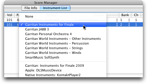 Finale unterstützt bis zu 128 MIDI-Kanäle, organisiert in 8 Bänken à 16 MIDI-Kanäle. Damit können gleichzeitig bis zu 128 verschiedene Instrumentklänge angesteuert werden. Über diese MIDI-Kanäle werden entweder interne Audio-Unit--Instrumente oder externe MIDI-Klangerzeuger angesprochen.