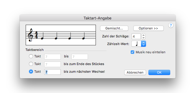 - OK • Abbrechen. Klicken Sie „OK“, um diese Dialogbox zu verlassen und in den angegebenen Takten die Taktart zu verändern. Klicken Sie „Abbrechen“, um diese Dialogbox zu verlassen, ohne die Taktart zu verändern.