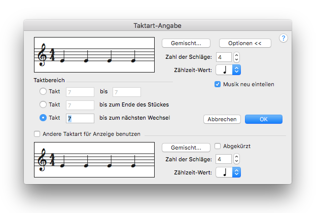 Die Dialogbox „Taktart-Angabe“ enthält ein Feld „Mehr Möglichkeiten“, mit dem Sie die Box erweitern können, wenn Sie es klicken, so dass einige zusätzliche Optionen erscheinen.