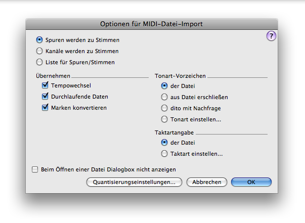 - Bei Öffnen einer Datei Dialogbox nicht anzeigen. Wählen Sie diese Option, wenn Sie möchten, dass die aktuellen Einstellungen der Dialogbox „Optionen für MIDI-Datei-Import“ beim nächsten Import einer MIDI-Datei verwendet werden. Es wird dann, wenn Sie eine MIDI-Datei importieren, nicht die Dialogbox „Optionen für MIDI-Datei-Import“ angezeigt. Sie wird nur angezeigt, wenn Sie „Optionen für MIDI-Datei-Import“ aus dem Menü „MIDI“ direkt anwählen. Wählen Sie diese Option wieder ab, um die Dialogbox „Optionen für MIDI-Datei-Import“ wieder anzuzeigen, wenn Sie eine MIDI-Datei importieren. Wenn Sie „Liste für Spuren-Stimmen-Zuordnung“ und „Bei Öffnen einer Datei Dialogbox nicht anzeigen“ angewählt haben, zeigt Finale direkt die Dialogbox „Spuren-/Kanalbelegung für Stimmen“ anstelle der Dialogbox „Optionen für MIDI-Datei-Import“. Siehe Spuren-/Kanalbelegung für Stimmen (Dialogbox) wegen einer vollständigen Erklärung.