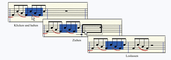 - Ziehen Sie mit gedrückt gehaltener Maustaste den ersten Quelltakt, so dass er den ersten Zieltakt überlagert. Wenn der erste Zieltakt nicht auf dem Bildschirm ist, blättern Sie solange, bis Sie ihn sehen. Dann halten Sie die STRG- und die Umschalttaste gedrückt und klicken in den ersten Zieltakt.