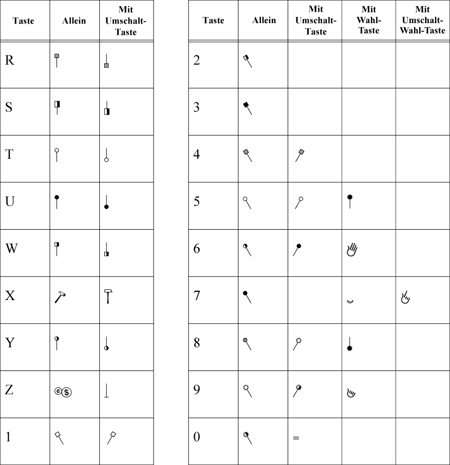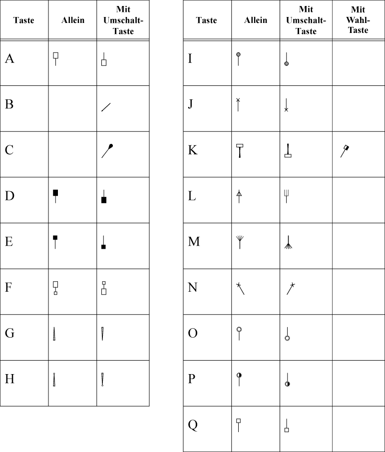 Dieser neue Zeichensatz enthält eine Vielzahl von Symbolen für verschiedene Schlägel, die auch für eine überkreuzte Darstellung kombiniert werden können. So könnte z. B. durch zwei kombinierte Symbole angezeigt werden, dass der Spieler in der linken Hand einen Garnschlägel und in der rechten Hand einen harten Schlägel verwenden soll.