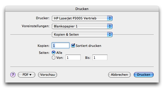 - Seiten: Alle • Von...Bis... Legen Sie den Seitenbereich fest, den Sie ausdrucken möchten. Wählen Sie entweder „Alle“ oder tragen Sie in die Felder „Von“ und „Bis“ die gewünschten Seitenzahlen ein.