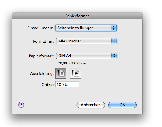 In dieser Dialogbox können Sie festlegen, auf welcher Papiergröße Sie drucken wollen; beachten Sie aber bitte, dass die Seitengröße der Partitur von der Papiergröße, die Sie hier angeben, völlig unabhängig ist. (Siehe Dokument-Assistent). Schließlich können Sie hier festlegen, ob Sie im Hoch- oder Querformat drucken möchten.