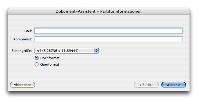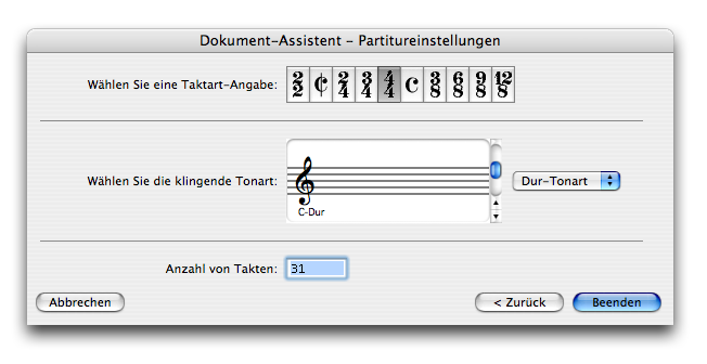 Der Dokument-Assistent hilft Ihnen, ein neues Dokument mit Titel, Notensystemen für die gewünschten Instrumente und mit anderen musikalischen Elementen anzulegen.