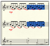 Wählt den Taktbereich an.Bei der Anwahl von Teiltakten markiert NotePad einen Bereich, der vor der ersten angewählten Noten beginnt und nach dem Zwischenraum hinter der letzten angewählten Note endet. Damit wird der Tatsache genüge getan, dass Sie nicht nur Notenzeichen, sondern zugleich auch einen musikalischen Zeitbereich anwählen