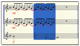 Unter einem eintaktigen Taktstapel ist also ein Takt zu verstehen, wie er von allen Instrumenten (Systemen) in der Akkolade gespielt wird – in anderen Worten also ein vertikaler Schnitt durch die Partitur. In der horizontalen Ausrichtung kann ein Taktstapel natürlich eine beliebige Anzahl (Länge) von Takten haben.Die Anwahl eines Taktstapels in einer Akkolade mit nur einem Notensytem erkennen Sie daran, dass die Bereichsmarkierung über die oberste und unterste Linie des Notensystems hinausgeht (siehe Abbildung).