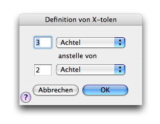 Nehmen wir einmal an, Sie möchten eine Achteltriole definieren. Klicken Sie das X-tolen-Werkzeug, wenn Sie sich in dem Notentext befinden und klicken Sie die ersten von drei aufeinanderfolgenden normalen Achtelnoten, die Sie in Triolen umformen wollen. Tragen Sie, sobald diese Dialogbox erscheint, eine „3“ und eine „2“ in die Textfelder ein (also „3 anstelle von 2“); klicken Sie „Achtel“ in jeder der beiden Spalten: 3 Achtel anstelle von 2 Achteln. (Sie könnten auch statt dessen eine Achteltriole definieren, indem Sie „3 Achtel anstelle von 1 Viertel“ eingeben.) Diese Textfelder betreffen nur die X-tole, die Sie gerade bearbeiten.