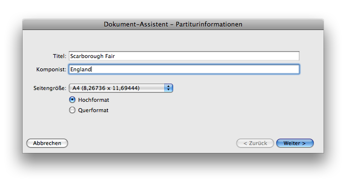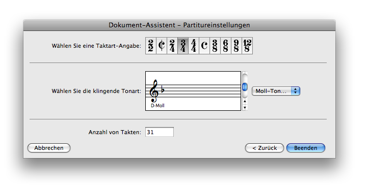 Sie starten NotePad über den Dokument-Assistenten. Auf den Seiten des Dokument-Assistenten legen Sie die Grundlagen Ihrer Partitur fest.