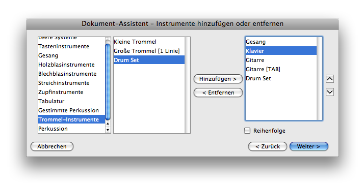 4. Fügen Sie Notensysteme für Gesang, Klavier, Gitarre und Gitarren-Tabulatur und Drum Set hinzu. Sie finden die Notensysteme für Gitarre und Gitarren-Tabulatur unter „Zupfinstrumente“. Drum Set finden Sie unter „Trommel-Instrumente“. Verwenden Sie die Pfeiltasten auf der rechten Seite, um die Notensysteme in die unten gezeigte Reihenfolge zu bringen.