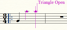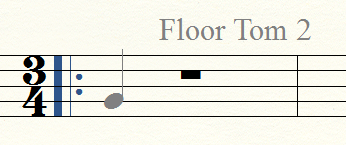Noten können mit der Einfachen Eingabe in ein Perkussionsnotensystem entweder durch Einklicken mit der Maus oder mit der Positionsmarke der Einfachen Eingabe notiert werden. Wenn Sie mit der Maus über das Perkussionsnotensystem streichen, werden Sie sehen, dass das der Mauszeiger den Notenkopf und die Bezeichnung des Perkussionsinstruments für jede Note, die Sie an dieser Stelle eingeben würden, anzeigt. Viele Perkussionsinstrumente werden auf derselben Linie oder im selben Zwischenraum notiert. Lassen Sie uns nun unserem Arrangement einen einfachen Rhythmus hinzufügen.