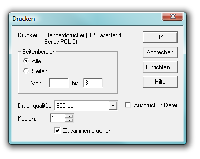 - Seiten: Alle • Von...Bis... Legen Sie den Seitenbereich fest, den Sie ausdrucken möchten. Wählen Sie entweder „Alle“ oder tragen Sie in die Felder „Von“ und „Bis“ die gewünschten Seitenzahlen ein.