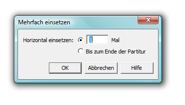 Bei der Verwendung des Befehls „Mehrfach einsetzen“ gibt Ihnen NotePad die Möglichkeit, eine beliebige Anzahl an Kopien eines kopierten Quellbereichs in die Partitur einzusetzen, eine Kopie nach der anderen. Dazu ein Beispiel: Wenn Sie eine eintaktige Bassfigur dreimal wiederholen lassen wollen, dann müssen Sie diese nur einmal eingeben (im ersten Takt). Verwenden Sie dann das Anwahl-Werkzeug, um diesen ersten Takt in den zweiten zu kopieren, indem Sie den Befehl „Mehrfach einsetzen“ nutzen. Es erscheint diese Dialogbox. Geben Sie nun an, wie oft der kopierte Takt eingesetzt werden soll. Geben Sie z. B. bei „Horizontal einsetzen“ die Ziffer „3“ ein und klicken dann „OK“, wird NotePad den Quelltakt in die Takte 2, 3 und 4 einsetzen.