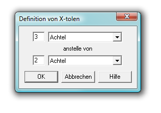 Nehmen wir einmal an, Sie möchten eine Achteltriole definieren. Klicken Sie das X-tolen-Werkzeug, wenn Sie sich in dem Notentext befinden und klicken Sie die ersten von drei aufeinanderfolgenden normalen Achtelnoten, die Sie in Triolen umformen wollen. Tragen Sie, sobald diese Dialogbox erscheint, eine „3“ und eine „2“ in die Textfelder ein (also „3 anstelle von 2“); klicken Sie „Achtel“ in jeder der beiden Spalten: 3 Achtel anstelle von 2 Achteln. (Sie könnten auch statt dessen eine Achteltriole definieren, indem Sie „3 Achtel anstelle von 1 Viertel“ eingeben.) Diese Textfelder betreffen nur die X-tole, die Sie gerade bearbeiten.
