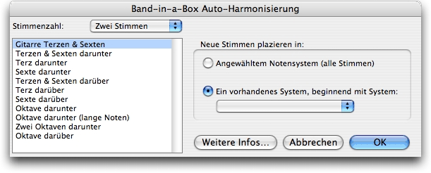Die Voreinstellungen „Gitarre“ und „Piano“ harmonisieren lange Noten aber keine kurzen Noten. Damit werden Spielweisen nachgebildet, bei denen es künstlerisch nicht sinnvoll (und technisch schwer realisierbar) ist, alle Noten einer Melodie zu harmonisieren. Die folgenden Voreinstellungen gehören zum Gitarren/Piano-Typ: Zwei Stimmen: „Gitarre Terzen und Sexten“, drei Stimmen: „Gitarre“, vier Stimmen: „Jazz Piano“, „Gitarre Drop 2“, „Swing-Gitarre“, fünf Stimmen: „Jazz Piano“, sechs Stimmen: „Gitarre“. Denken Sie daran, die Noten in die passende Anzahl von Notensystemen zu platzieren.