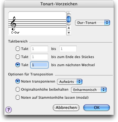 - OK • Abbrechen. Klicken Sie ‘OK’, um Ihre Wahl einer neuen Tonart zu bestätigen und zur Partitur zurückzukehren, wo die Tonart gemäß Ihren Angaben wechselt. Klicken Sie ‘Abbrechen’, um zur Partitur zurückzukehren, ohne die Tonart zu wechseln.