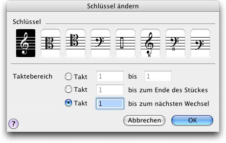 Sie können am Beginn eines beliebigen Taktes in der Partitur den Schlüssel wechseln. In dieser Dialogbox setzen Sie fest, welchen Schlüssel Sie benutzen wollen.