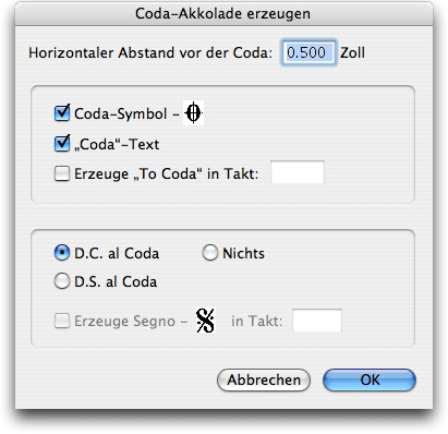 - Coda-Symbol • „Coda“-Text • Erzeuge „To Coda“ in Takt __. Aktivieren Sie „Coda-Symbol“, um das übliche Coda-Symbol am Beginn Ihrer Coda-Akkolade anzuzeigen. Aktivieren Sie „Coda“-Text“, um den Text „Coda“ am Beginn der Coda-Akkolade anzuzeigen. Diese beiden Optionen sind in der Voreinstellung aktiviert. Aktivieren Sie „Erzeuge „To Coda“ in Takt“, und geben Sie eine Taktzahl ein, um in diesem Takt die Angabe „To Coda“ einzusetzen.