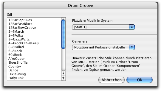 In der Dialogbox „Drum Groove“ können Sie in der Partitur eine Perkussionsstimme mit einem von vielen verschiedenen Rhythmen oder „Drum Grooves“ anlegen. Diese Drum Grooves enthalten Perkussionsnotation mit einer zugehörigen Perkussionstabelle.