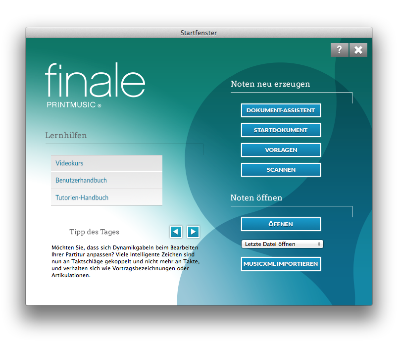 Wählen Sie Datei > Startfenster. Dieses Fenster erscheint ebenfalls, wenn Sie das Programm PrintMusic starten.