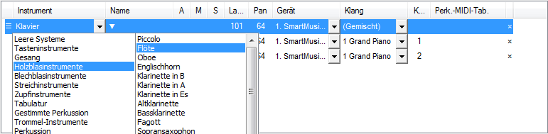 In PrintMusic finden Sie Instrumente mit mehreren Notensystemen in einem Aufklappmenü: