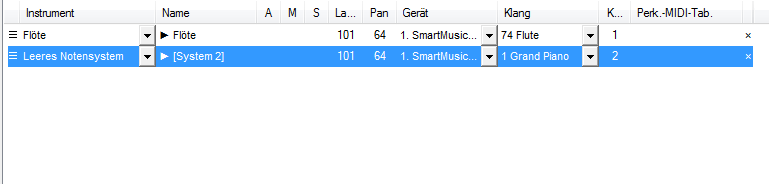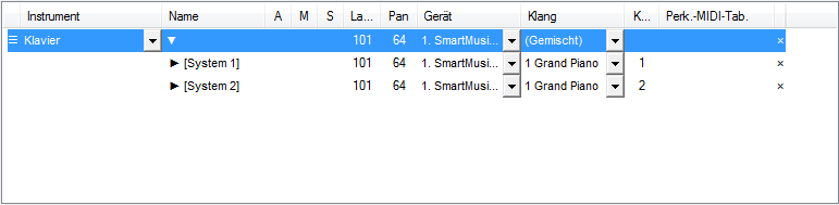 Anfangs zeigt die Partiturverwaltung jedes Instrument als einzelne Spalte, unabhängig davon, wie viel Notensysteme das Instrument umfasst. Ein Klavier wird üblicherweise in zwei Notensysteme notiert, ein Violinschlüssel für die rechte Hand und ein Bassschlüssel für die linke Hand. Klicken Sie auf das kleine Erweiterungsdreieck neben dem Instrumentennamen, um Zugang zu allen Notensystemen zu erhalten.