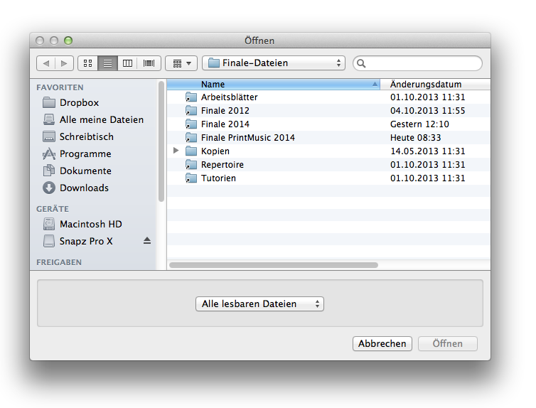 - Wählen Sie den Dateityp, den Sie öffnen oder speichern möchten aus dem Auflappmenü oder wählen Sie „Alle Dateien“, dann bekommen Sie alle Datein, unabhängig vom Dateityp angezeigt. Voreingestellt ist „Alle lesbaren Dateien“.