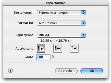 Diese Macintosh-Standard-Dialogbox „Papierformat“ fällt je nach dem Drucker, den Sie benutzen (und der Version des Macintosh-Systems), verschieden aus. In dieser Dialogbox können Sie angeben, auf welcher Papiergröße Sie drucken wollen; beachten Sie aber bitte dabei, dass die Seitengröße der Partitur von der Papiergröße, die Sie hier angeben, völlig unabhängig ist. (Benutzen Sie das Seitenlayout-Werkzeug, um die Größe des tatsächlichen Druckbildes festzulegen; siehe Seitengröße.) Um sicherzugehen, dass nichts von der Musik abgeschnitten wird, wenn Sie sie drucken, sollte die Größe der Seite, die durch das Seitenlayout-Werkzeug bestimmt wird gleich oder kleiner sein als das, was Sie in der Dialogbox „Papierformat“ angeben. Schließlich können Sie in dieser Dialogbox noch Ihre Wahl bezüglich des Formats (ob hoch oder quer) angeben.