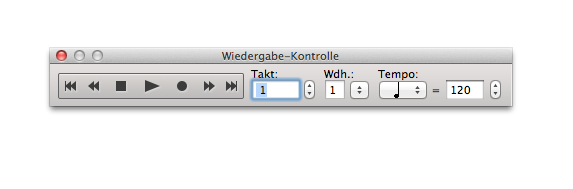 Die Wiedergabe-Kontrolle ist ein flexibles Fenster, das Ihnen Felder für die Kontrolle der Wiedergabe Ihrer Partitur an die Hand gibt, die wie die Knöpfe eines Kassettenrecorders aussehen.