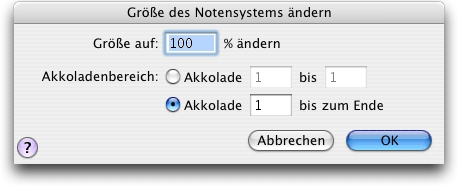 Sie befinden sich hier: Referenz > Paletten, Werkzeuge, Menüs & Dialogboxen > Dialogboxen > Größe des Notensystems ändern