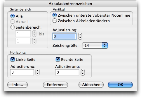 - Entfernen. Klicken Sie „Entfernen“, um Akkoladentrennzeichen, die Sie mit diesem Plug-In hinzugefügt hatten, wieder zu entfernen. Beachten Sie bitte, dass Trennzeichen, die Sie von Hand verändert haben, nicht automatisch entfernt werden können. Es wird deshalb empfohlen, die Akkoladentrennzeichen nicht von Hand zu bearbeiten. Denken Sie daran, dass Sie mit dem Befehl „Widerrufen“ aus dem Menü „Bearbeiten“ die Trennzeichen sofort nach dem Erzeugen wieder entfernen können, wenn Sie mit dem Ergebnis nicht zufrieden sind.