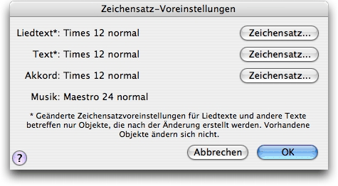 In dieser Dialogbox können Sie den Zeichensatz für viele Elemente in Ihrer Partitur voreinstellen. Entweder werden alle Elemente dieses Typs gleichzeitig geändert, oder Sie geben hier den Zeichensatz für diesen Elementtyp an, den Sie am häufigsten benötigen.