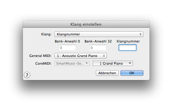 - Klang • Bank-Anwahl 0, Bank-Anwahl 32, Klangnummer • General MIDI. Um Bank- oder Klangwechsel-Daten vom MIDI-Werkzeug aus einzugeben, folgen Sie dem normalen Ablauf zur Eingabe einfacher Klangänderungen, und geben Sie dann die Werte für die Klangnummer und die gewünschte Bank in die erscheinende Dialogbox „Einstellen“ ein. Sie können das gewünschte Instrument auch aus dem Einblendmenü „General MIDI“ auswählen, um automatisch die erforderlichen Klangprogramm und Bankwechsel-Befehle einzustellen.