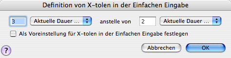 In dieser Dialogbox können Sie die rhythmischen Aspekte einer X-tolen-Gruppe definieren – z. B. die Anzahl von Achtelnoten, die im Zeitraum einer Viertelnote gespielt werden sollen. Verwenden Sie diese Dialogbox für X-tolen, deren Komplexität über eine Triole im aktuellen Notenwert hinausgehen. Siehe auch X-tolen (Einfache Eingabe).
