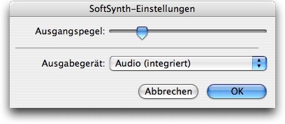 In dieser Dialogbox wählen Sie den Audiotreiber, den Sie für die Ausgabe des SoftSynths verwenden möchten, und stellen dessen Lautstärke ein. In diesem Fenster vorgenommene Einstellungen wirken sich auf Audiodateien aus, die Sie mit dem Befehl Exportieren > Audiodatei erstellen.