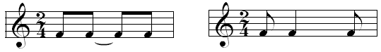Links: Angebundene Synkopennotation. Rechts: „geraffte“ Synkopennotation
