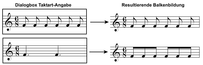 Die Art, in der Sie Ihre Taktart definieren, ist wichtig, denn sie bestimmt die Balkenbildung. Im Falle eines Alla-Breve-Taktes zum Beispiel sollten Sie die Rollbalken so einstellen, dass zwei halbe Noten angezeigt werden und somit die Achtelnoten in Vierergruppen balkiert werden. Dies ist besonders wichtig, wenn Sie in einem -Takt oder einem verwandten Metrum arbeiten; wenn Sie die Taktart-Angabe als eine Folge von sechs Achtelnoten beschreiben, wird PrintMusic überhaupt keine automatische Balkenbildung bei Achtelnoten durchführen, wie es unten gezeigt wird (oberes Beispiel). Wenn Sie den -Takt jedoch als zwei punktierte Viertelnoten beschreiben, wird PrintMusic Achtelnoten in Dreiergruppen mit Balken verbinden (unteres Beispiel).