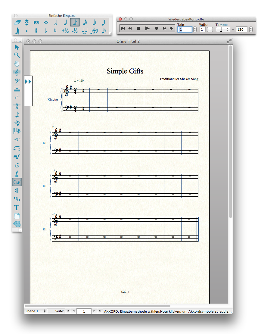 Der Part der linken Hand wurde bereits für Sie vorbereitet. Mit Hilfe dieses Tutoriums werden Sie die Melodie eingeben.