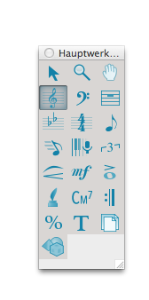 Die einzelnen Werkzeuge innerhalb der Paletten klicken Sie an, um einen bestimmten rhythmischen Wert oder andere Attribute auszuwählen. In erster Linie dienen die Werkzeuge natürlich zur unmittelbaren Noteneingabe. Die einzelnen Werkzeuge innerhalb einer Palette sind nochmal in verschiedene Gruppen untergliedert und angeordnet. So finden Sie eine Gruppe zur Auswahl des rhythmischen Werts, so etwa mit Symbolen für Viertelnote, Achtelnote usw. Weiterhin sehen Sie Werkzeuge für Vorzeichen wie Kreuz, B oder Auflösungszeichen, ein Haltebogen-Werkzeug, ein X-tolen-Werkzeug und u. a. schließlich ein Werkzeug zum Einfügen von Vorschlagsnoten.