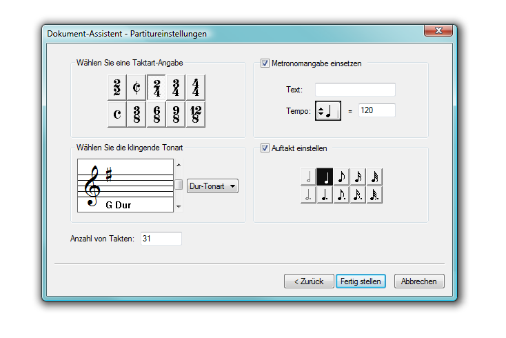 - Klicken Sie Weiter. Auf der nächsten Seite des Dokument-Assistenten werden Sie nun um die Angabe der Taktart, der Tonart, der Metronomangabe und des Auftakts gebeten.