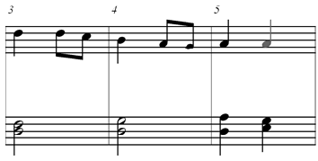 - Geben Sie die Noten in Takt 3 bis 5 wie rechts gezeigt ein. Wenn Sie eine falsche Notendauer eingeben haben, halten Sie die Alt-Taste und geben Sie die korrekte Dauer über den Ziffernblock ein. (Erinnern Sie